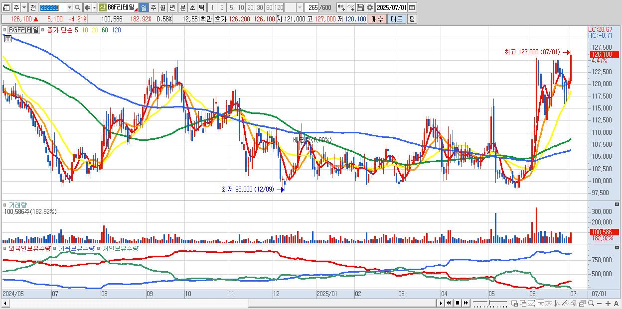 - BGF리테일 (126,200원 ▲ 4.3% , 시총: 21,812억, 거래량: 84,018, 거래대금:105억, KOSPI)