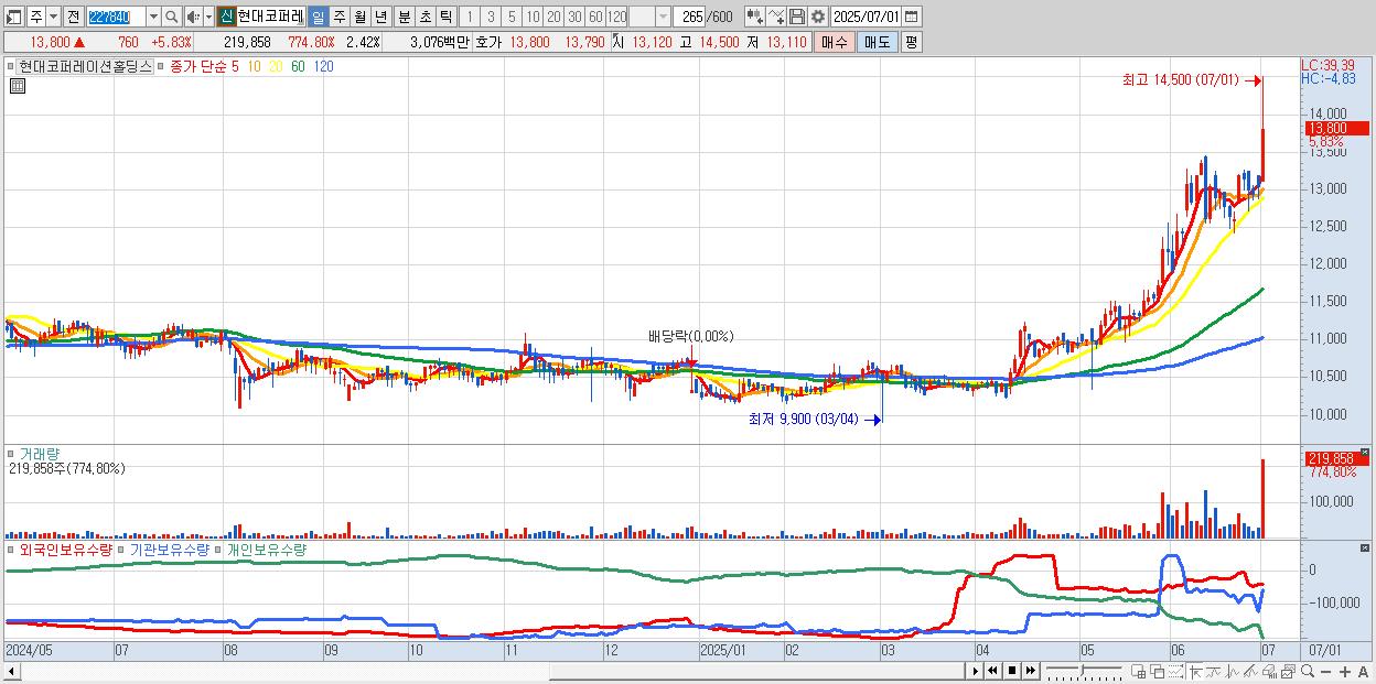 - 현대코퍼레이션홀딩스 (13,800원 ▲ 5.83% , 시총: 1,256억, 거래량: 219,858, 거래대금:31억, KOSPI)