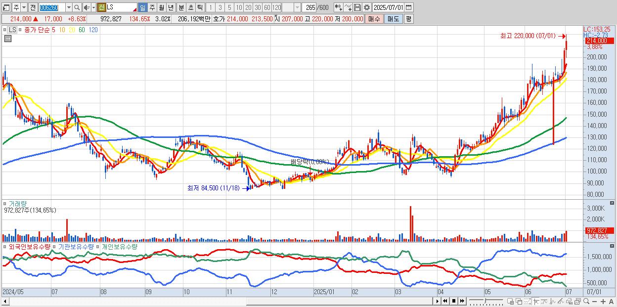 - LS (211,000원 ▲ 7.11% , 시총: 67,942억, 거래량: 643,209, 거래대금:1,364억, KOSPI)