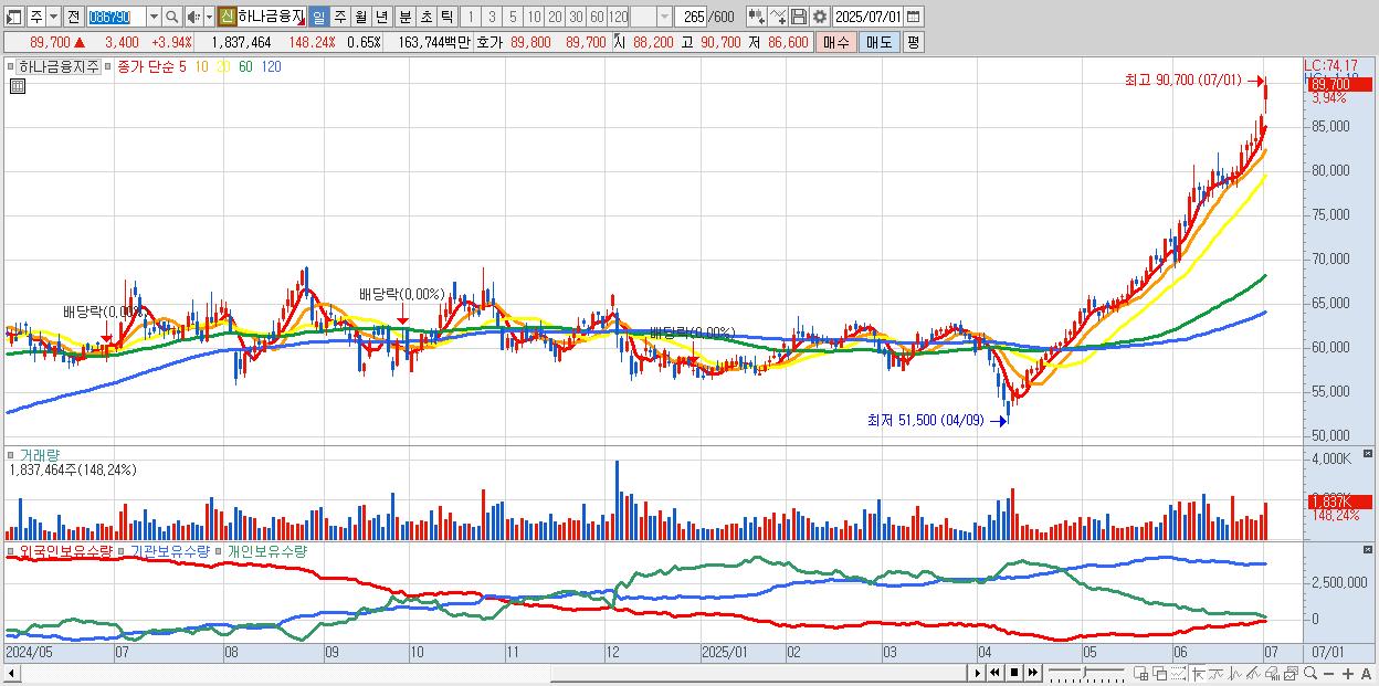 - 하나금융지주 (88,900원 ▲ 3.01% , 시총: 253,120억, 거래량: 1,687,688, 거래대금:1,504억, KOSPI)