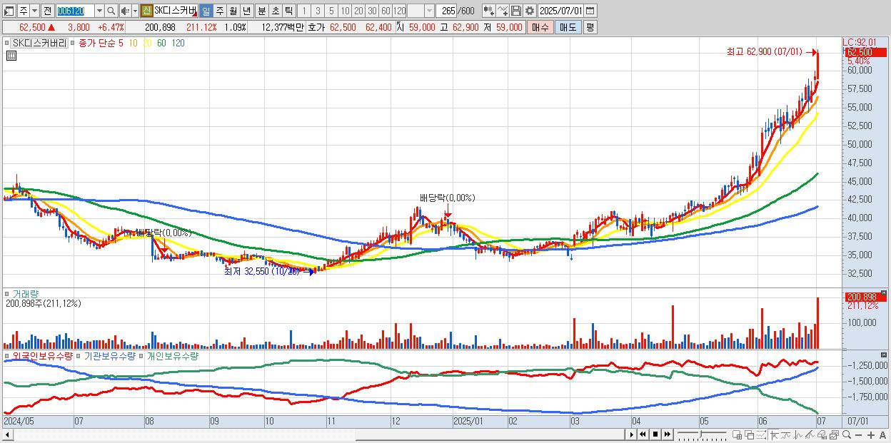 - SK디스커버리 (61,900원 ▲ 5.45% , 시총: 11,357억, 거래량: 154,558, 거래대금:95억, KOSPI)