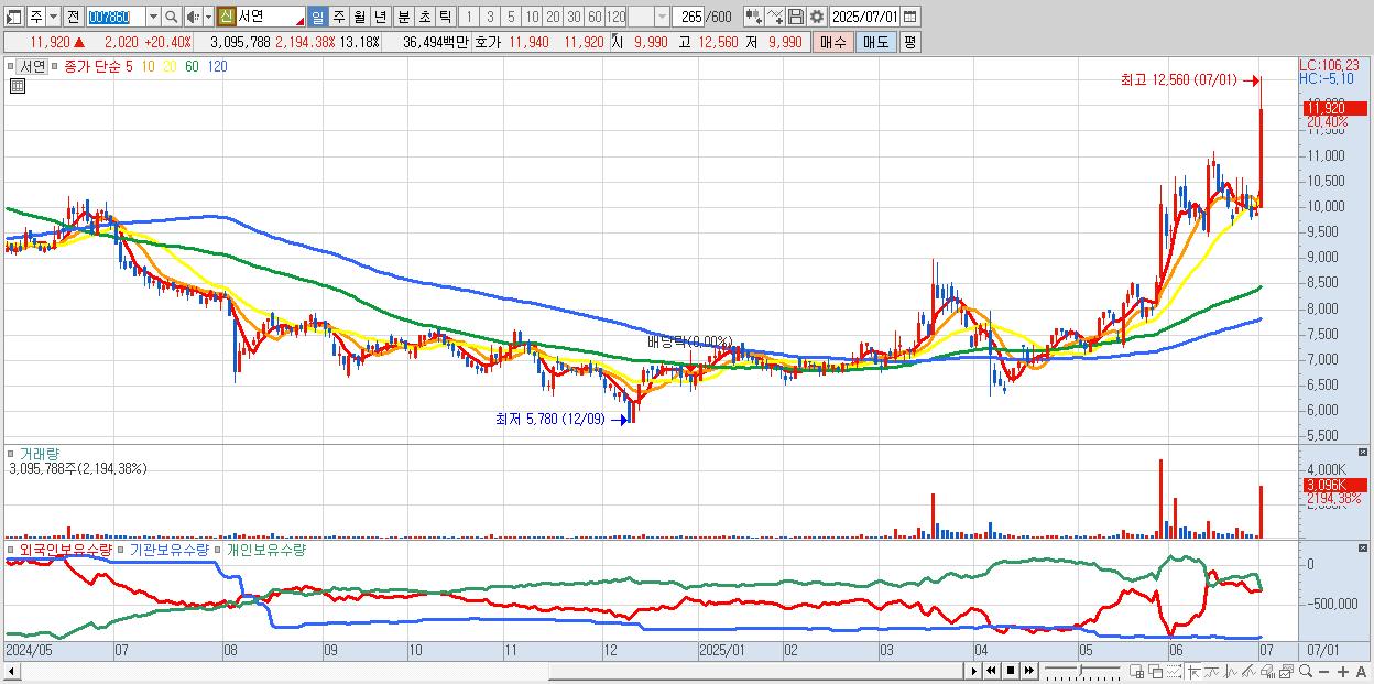 - 서연 (11,440원 ▲ 15.56% , 시총: 2,686억, 거래량: 1,012,834, 거래대금:115억, KOSPI)