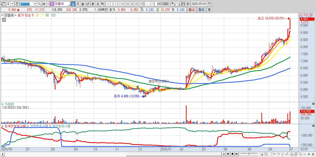 - 이엘씨 (9,960원 ▲ 7.21% , 시총: 1,214억, 거래량: 118,555, 거래대금:12억, KOSDAQ)