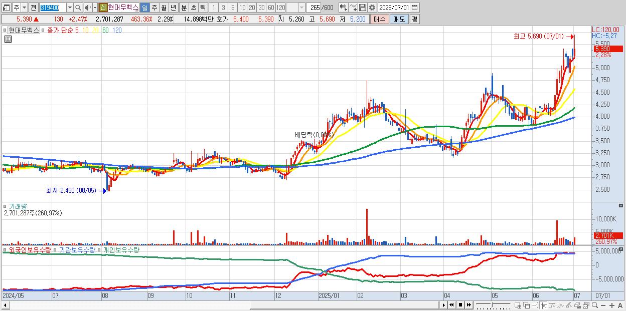 - 현대무벡스 (5,390원 ▲ 2.47% , 시총: 6,352억, 거래량: 2,701,287, 거래대금:149억, KOSDAQ)