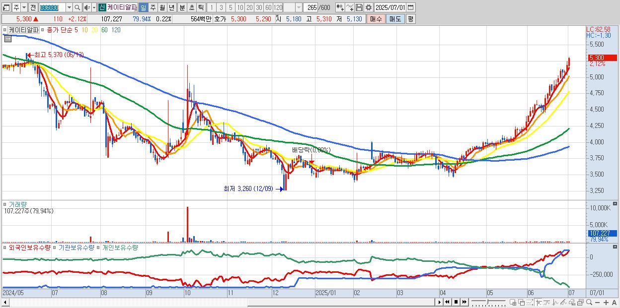 - 케이티알파 (5,300원 ▲ 2.12% , 시총: 2,598억, 거래량: 107,227, 거래대금:6억, KOSDAQ)