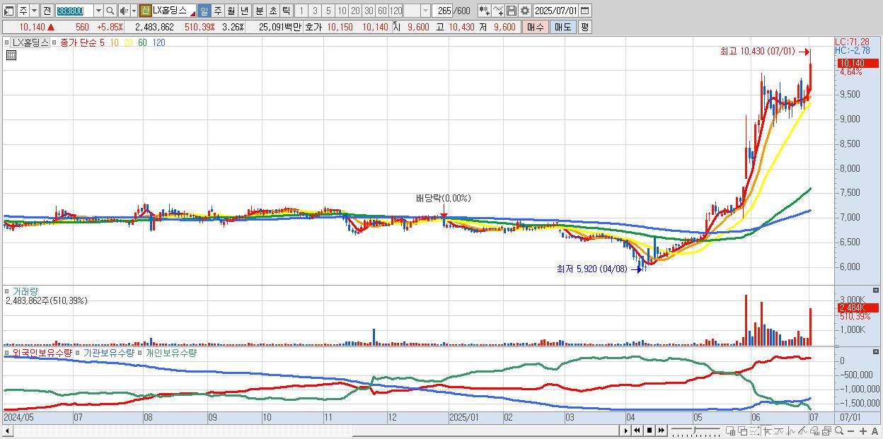 - LX홀딩스 (10,000원 ▲ 4.38% , 시총: 7,628억, 거래량: 1,443,435, 거래대금:146억, KOSPI)