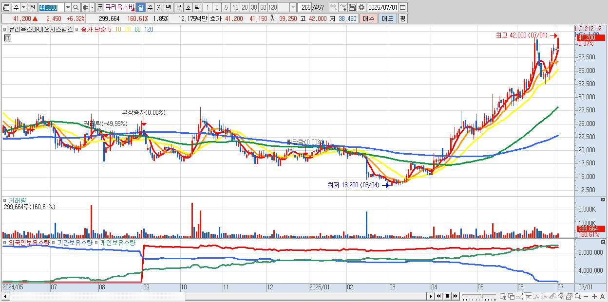 - 큐리옥스바이오시스템즈 (41,300원 ▲ 6.58% , 시총: 6,675억, 거래량: 164,808, 거래대금:67억, KOSDAQ)