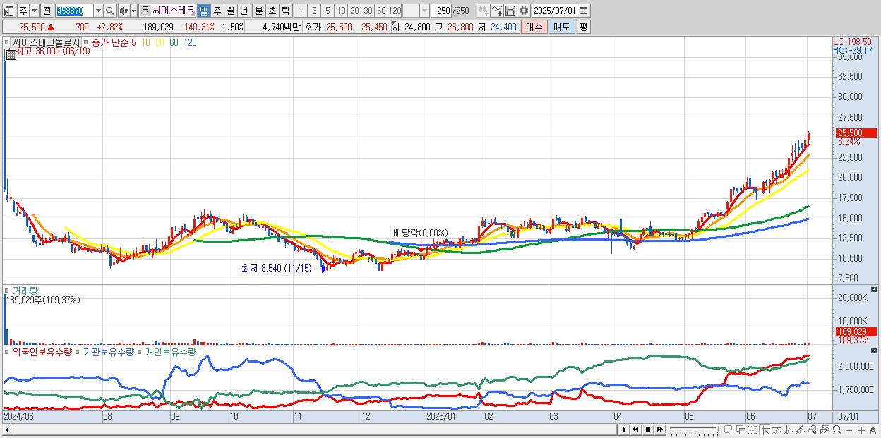 - 씨어스테크놀로지 (25,500원 ▲ 2.82% , 시총: 3,211억, 거래량: 189,029, 거래대금:47억, KOSDAQ)