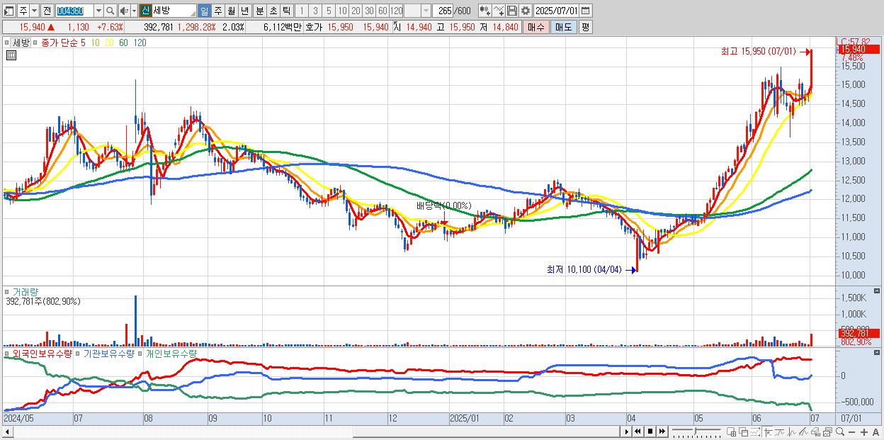 - 세방 (15,940원 ▲ 7.63% , 시총: 3,078억, 거래량: 392,781, 거래대금:61억, KOSPI)