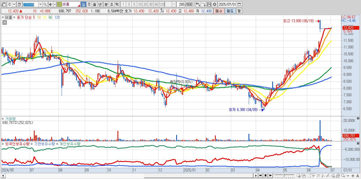 - 비올 (12,430원 ▲ 0.16% , 시총: 7,261억, 거래량: 557,746, 거래대금:69억, KOSDAQ)