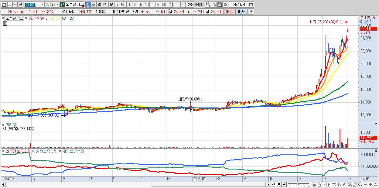 - 노루홀딩스 (25,500원 ▲ 5.37% , 시총: 3,389억, 거래량: 455,810, 거래대금:117억, KOSPI)