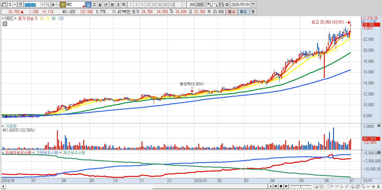 - HDC (24,500원 ▲ 4.26% , 시총: 14,637억, 거래량: 375,001, 거래대금:93억, KOSPI)