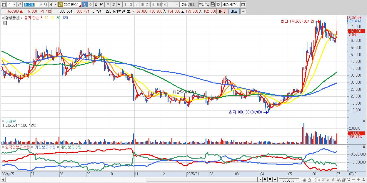 - 삼성물산 (165,400원 ▲ 2.48% , 시총: 281,141억, 거래량: 943,258, 거래대금:1,594억)