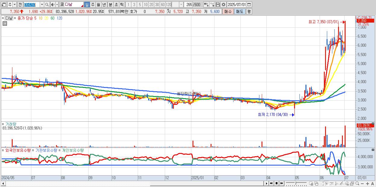 - 다날 (7,350원 ▲ 29.86% , 시총: 5,068억, 거래량: 42,430,552, 거래대금:2,905억)