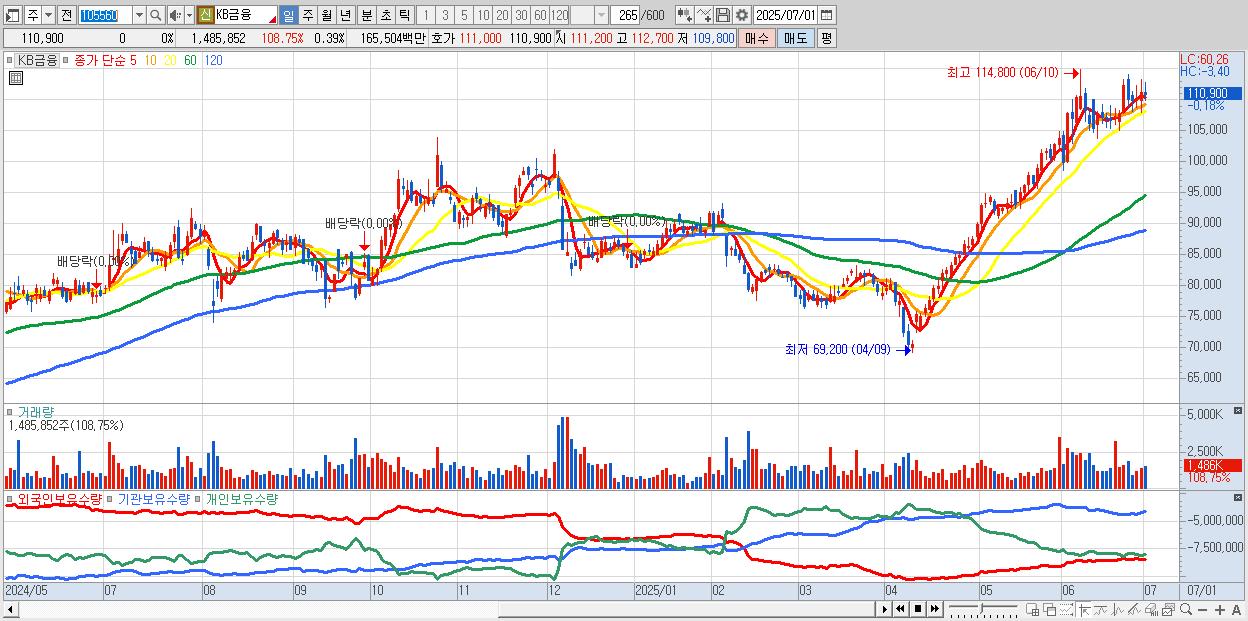 - KB금융 (110,800원 ▼ -0.09% , 시총: 422,660억, 거래량: 1,391,114, 거래대금:1,549억)