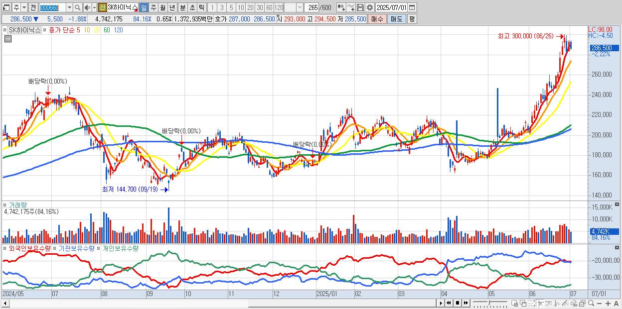 - SK하이닉스 (285,500원 ▼ -2.23% , 시총: 2,078,447억, 거래량: 3,687,981, 거래대금:10,674억)