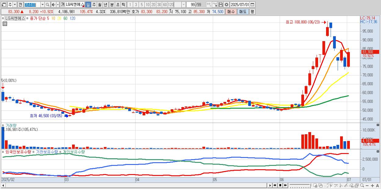 - LG씨엔에스 (80,800원 ▲ 7.59% , 시총: 78,284억, 거래량: 1,888,255, 거래대금:1,512억)