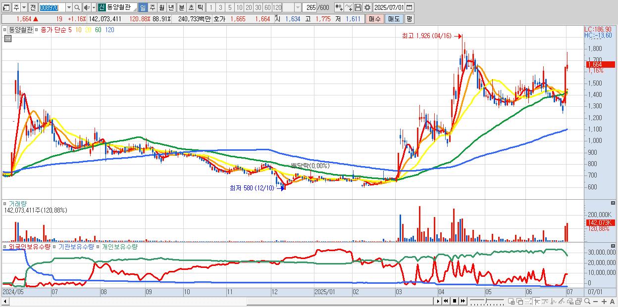 - 동양철관 (1,664원 ▲ 1.16% , 시총: 2,659억, 거래량: 142,073,411, 거래대금:2,407억)