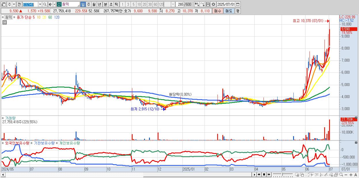 - 원익 (9,590원 ▲ 19.58% , 시총: 1,745억, 거래량: 27,759,418, 거래대금:2,678억)