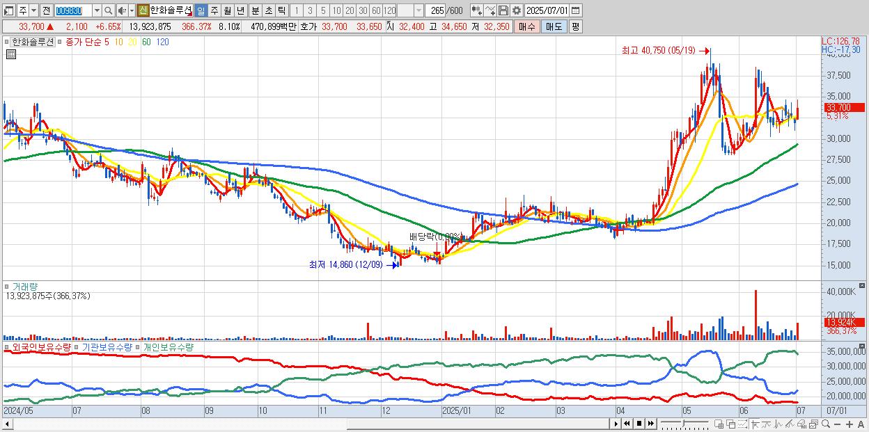 - 한화솔루션 (33,400원 ▲ 5.7% , 시총: 57,412억, 거래량: 7,090,674, 거래대금:2,403억)