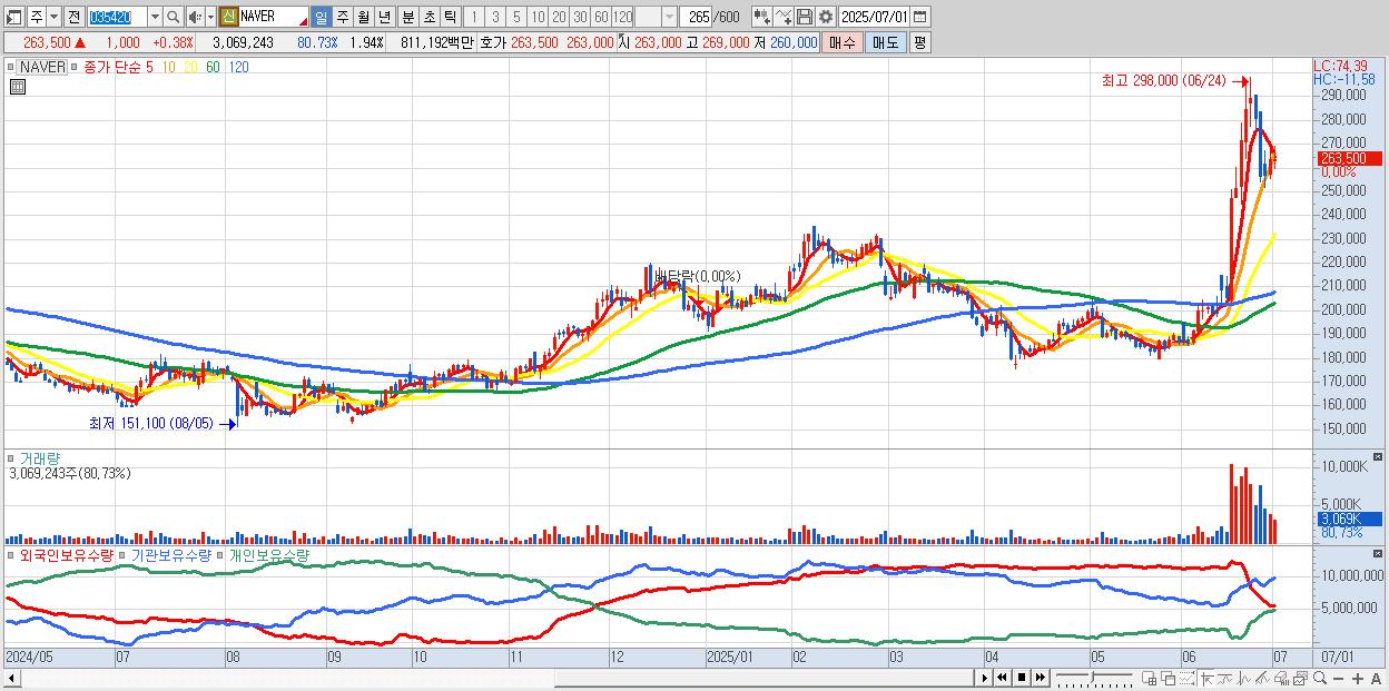 - NAVER (262,000원 ▼ -0.19% , 시총: 415,105억, 거래량: 1,791,173, 거래대금:4,734억)