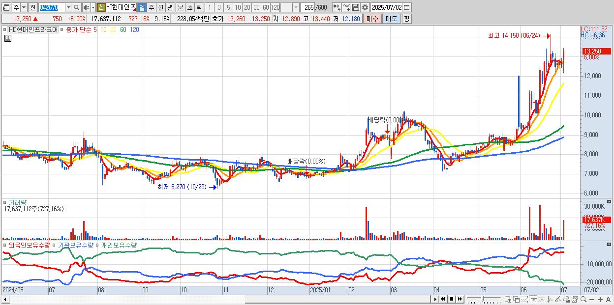 - HD현대인프라코어 (13,190원 ▲ 5.52% , 시총: 25,403억, 외국인 순매수 거래금:210억)
