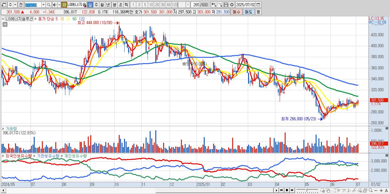 - LG에너지솔루션 (302,500원 ▲ 1.68% , 시총: 707,850억, 외국인 순매수 거래금:135억)