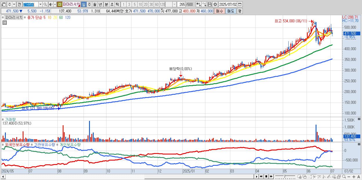 - 파마리서치 (470,000원 ▼ -1.47% , 시총: 49,395억, 외국인 순매수 거래금:134억)