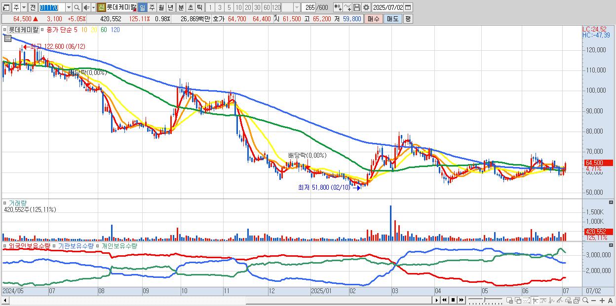 - 롯데케미칼 (65,100원 ▲ 6.03% , 시총: 27,847억, 외국인 순매수 거래금:92억)