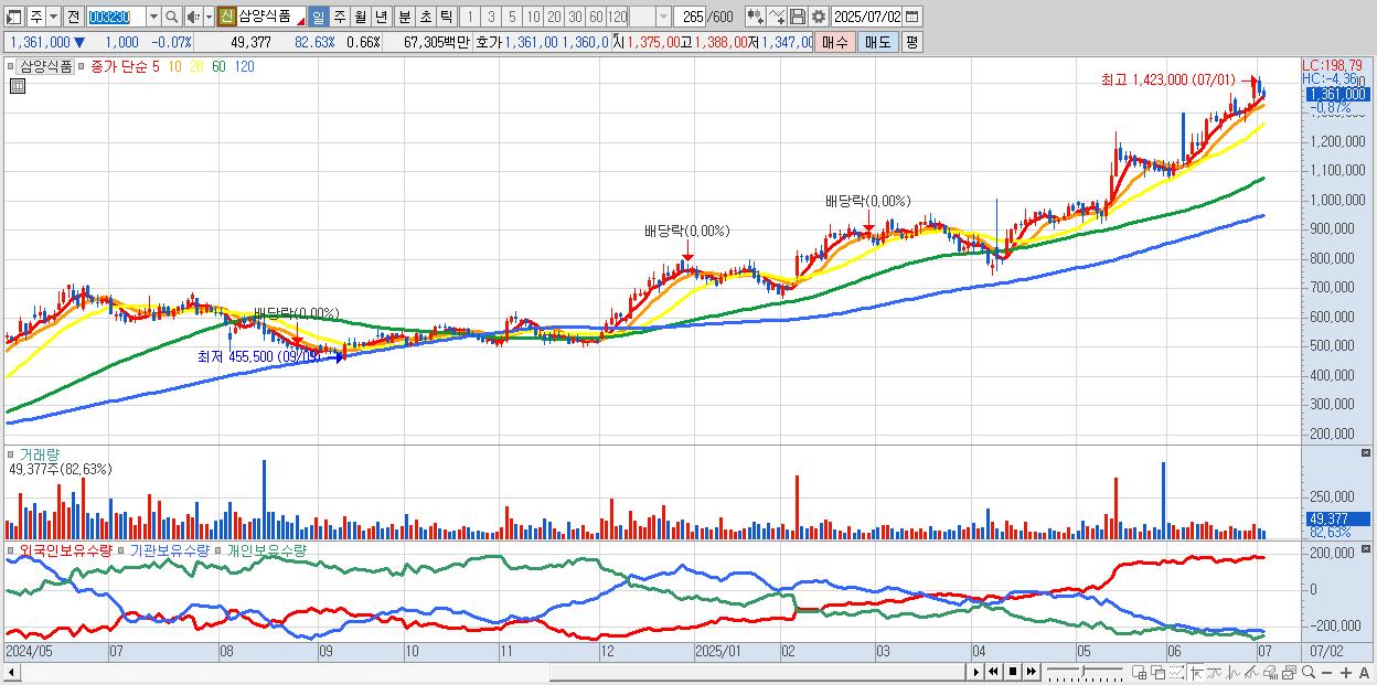 - 삼양식품 (1,362,000원 0% , 시총: 102,600억, 외국인 순매수 거래금:54억)
