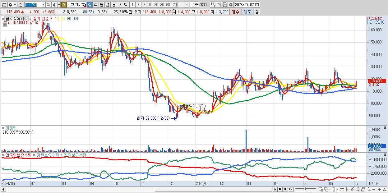 - 금호석유화학 (118,600원 ▲ 3.85% , 시총: 31,381억, 외국인 순매수 거래금:71억)