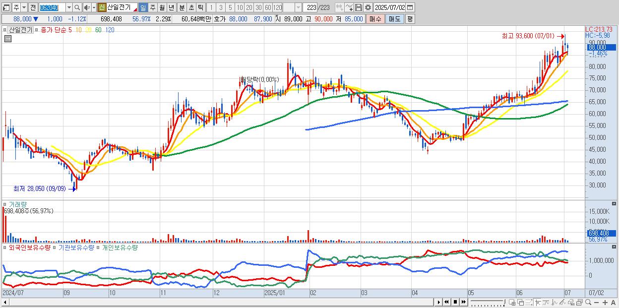 - 산일전기 (88,400원 ▼ -0.67% , 시총: 26,914억, 외국인 순매수 거래금:56억)