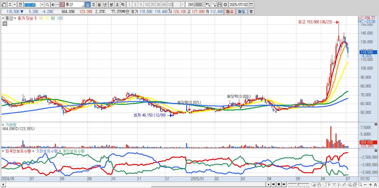- 풍산 (118,500원 ▼ -4.2% , 시총: 33,209억, 외국인 순매수 거래금:131억)