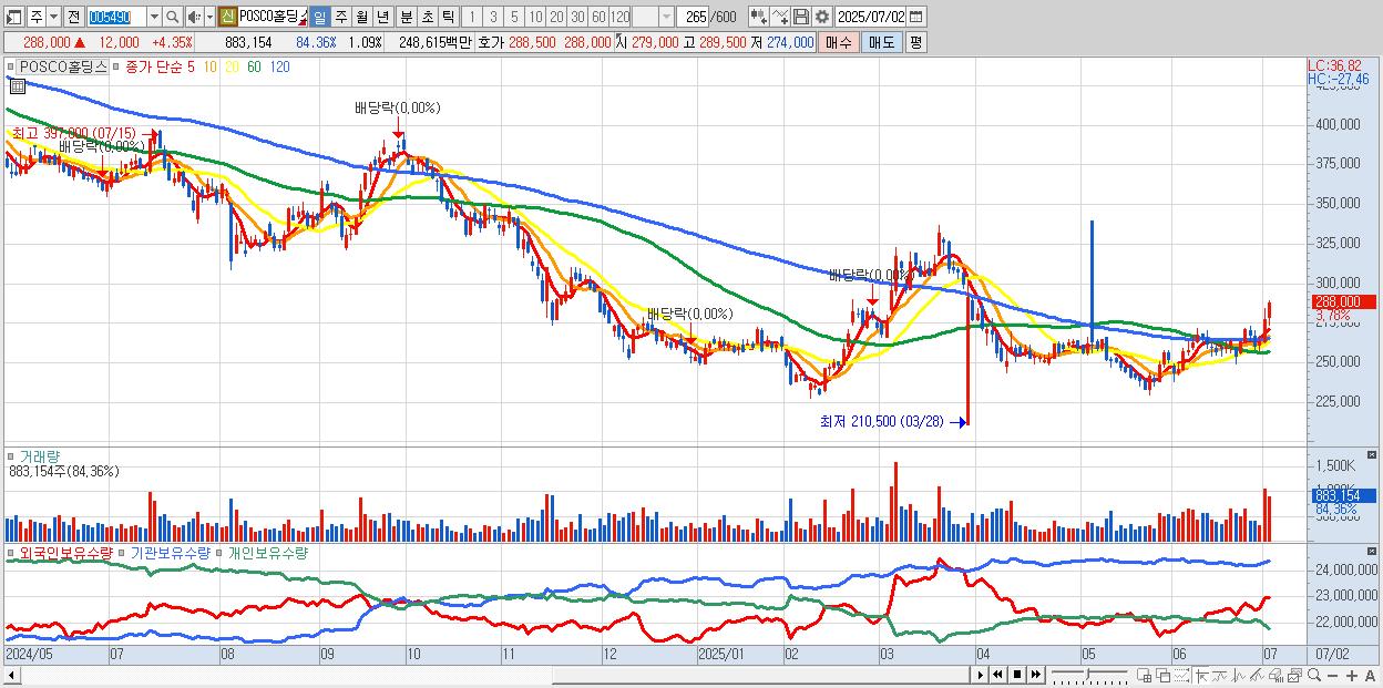 - POSCO홀딩스 (288,000원 ▲ 4.35% , 시총: 233,087억, 외국인 순매수 거래금:185억)