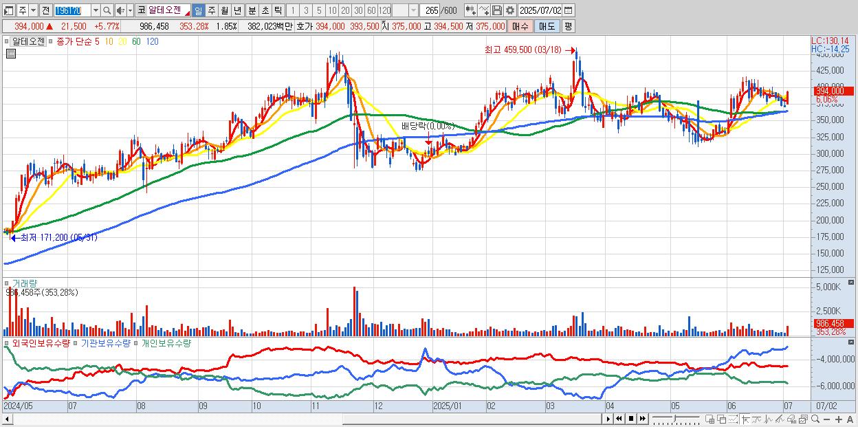 - 알테오젠 (392,500원 ▲ 5.37% , 시총: 209,850억, 외국인 순매수 거래금:138억)