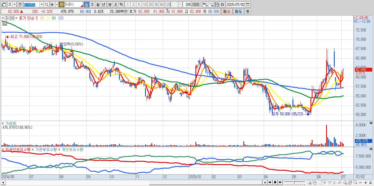 - S-Oil (62,200원 ▲ 0.65% , 시총: 70,026억, 외국인 순매수 거래금:59억)