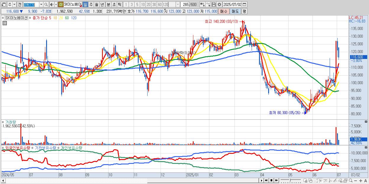 - SK이노베이션 (117,700원 ▼ -6.96% , 시총: 177,768억, 외국인 순매수 거래금:115억)