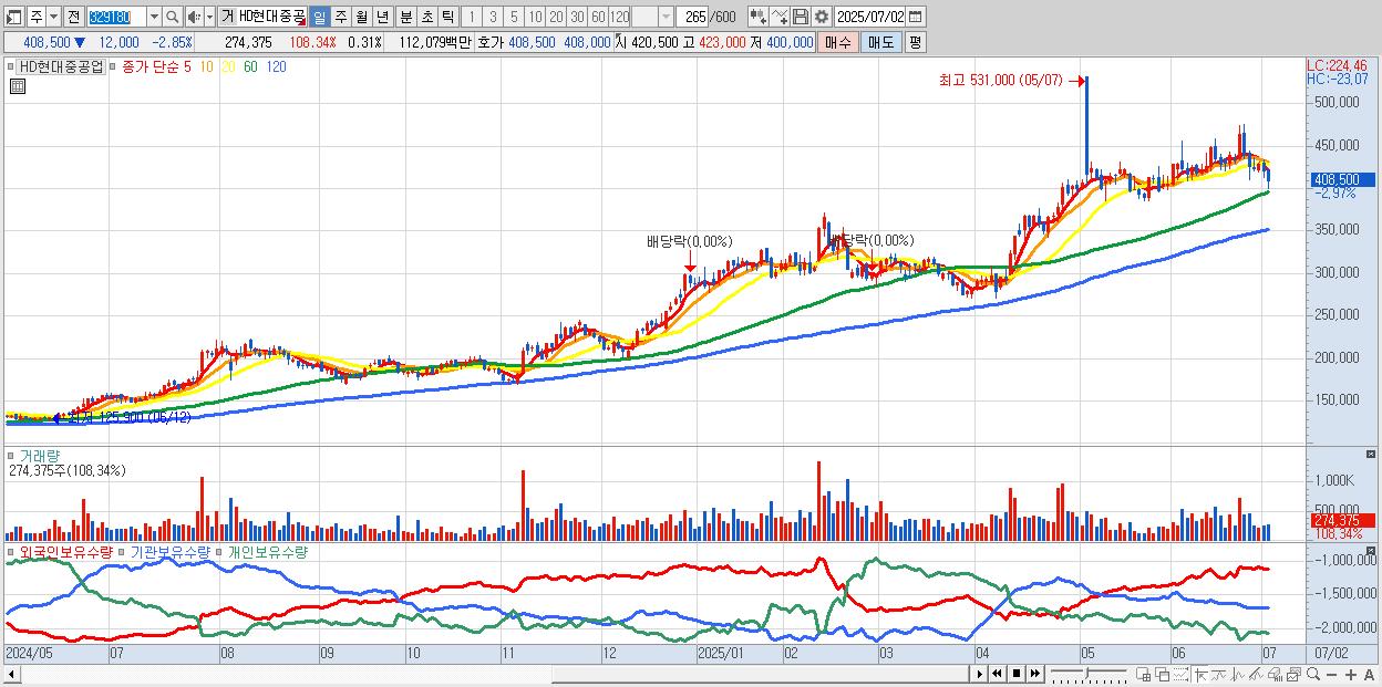 - HD현대중공업 (407,500원 ▼ -3.09% , 시총: 361,750억, 외국인 순매수 거래금:80억)