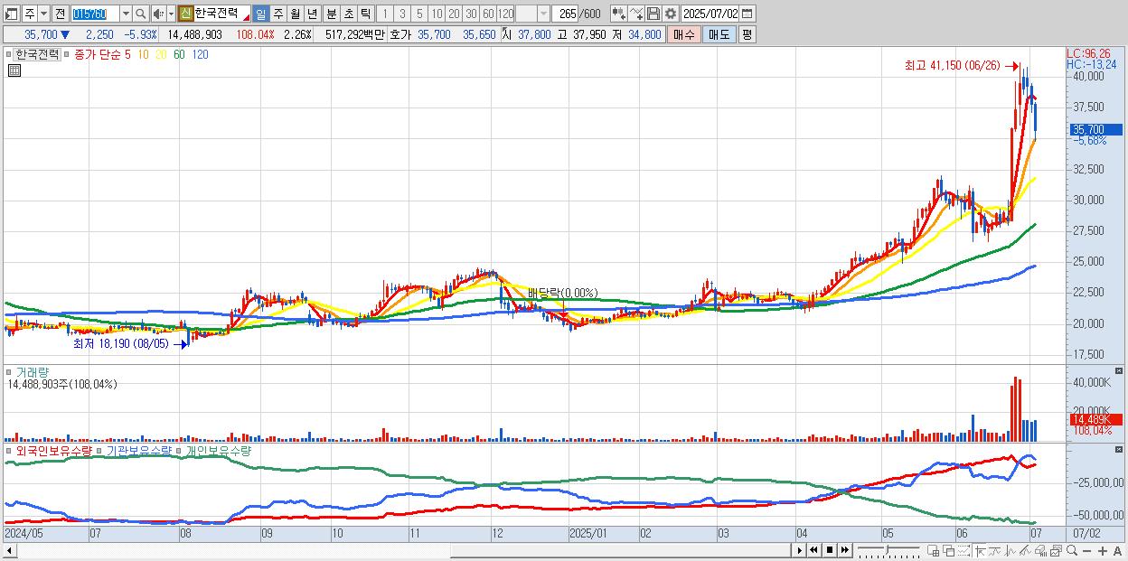 - 한국전력 (35,950원 ▼ -5.27% , 시총: 230,786억, 거래량: 9,018,364, 거래대금:3,213억)