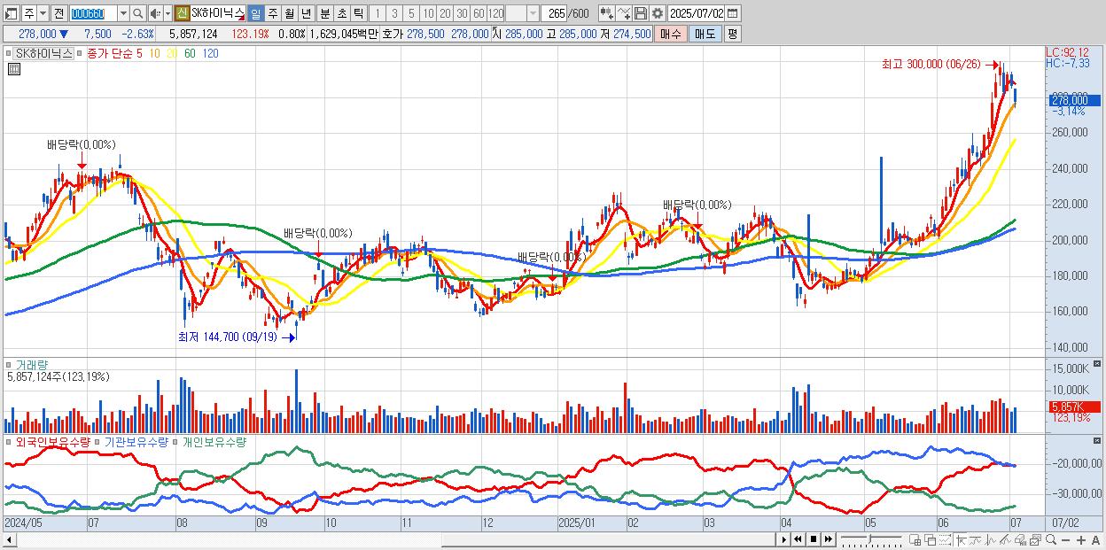 - SK하이닉스 (279,000원 ▼ -2.28% , 시총: 2,031,127억, 거래량: 4,702,056, 거래대금:13,076억)