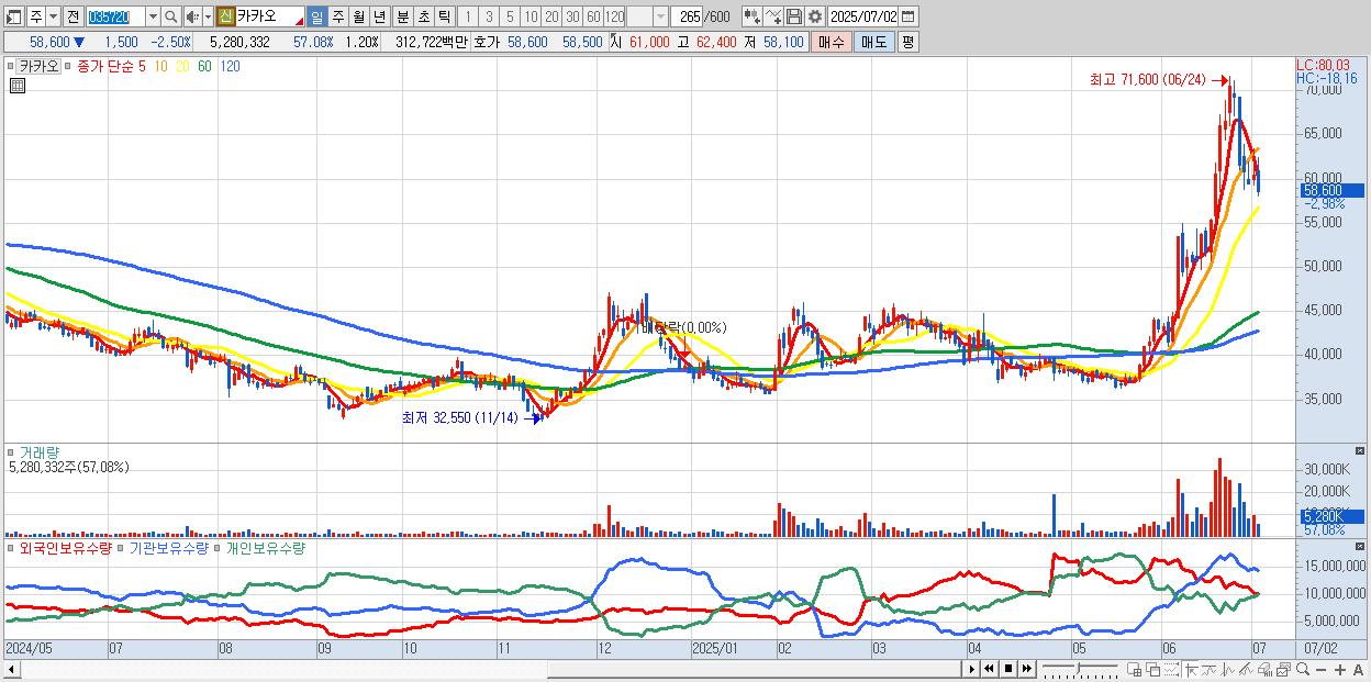 - 카카오 (58,700원 ▼ -2.33% , 시총: 259,317억, 거래량: 2,974,555, 거래대금:1,758억)