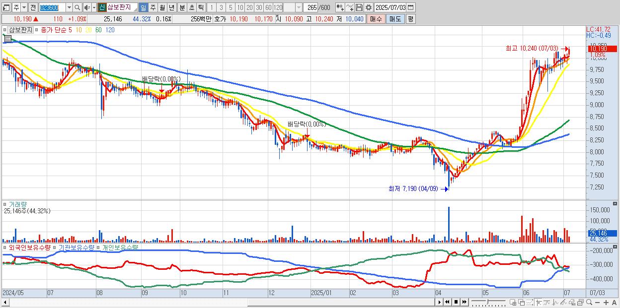 - 삼보판지 (10,190원 ▲ 1.09% , 시총: 1,648억, 거래량: 25,146, 거래대금:3억, KOSDAQ)
