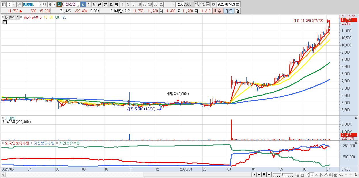 - 대원산업 (11,750원 ▲ 5.29% , 시총: 2,354억, 거래량: 71,425, 거래대금:8억, KOSDAQ)