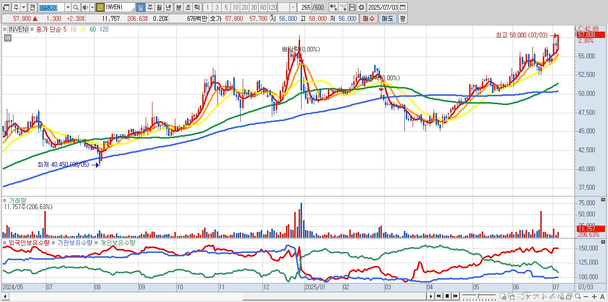 - INVENI (57,800원 ▲ 2.3% , 시총: 3,468억, 거래량: 11,757, 거래대금:7억, KOSPI)