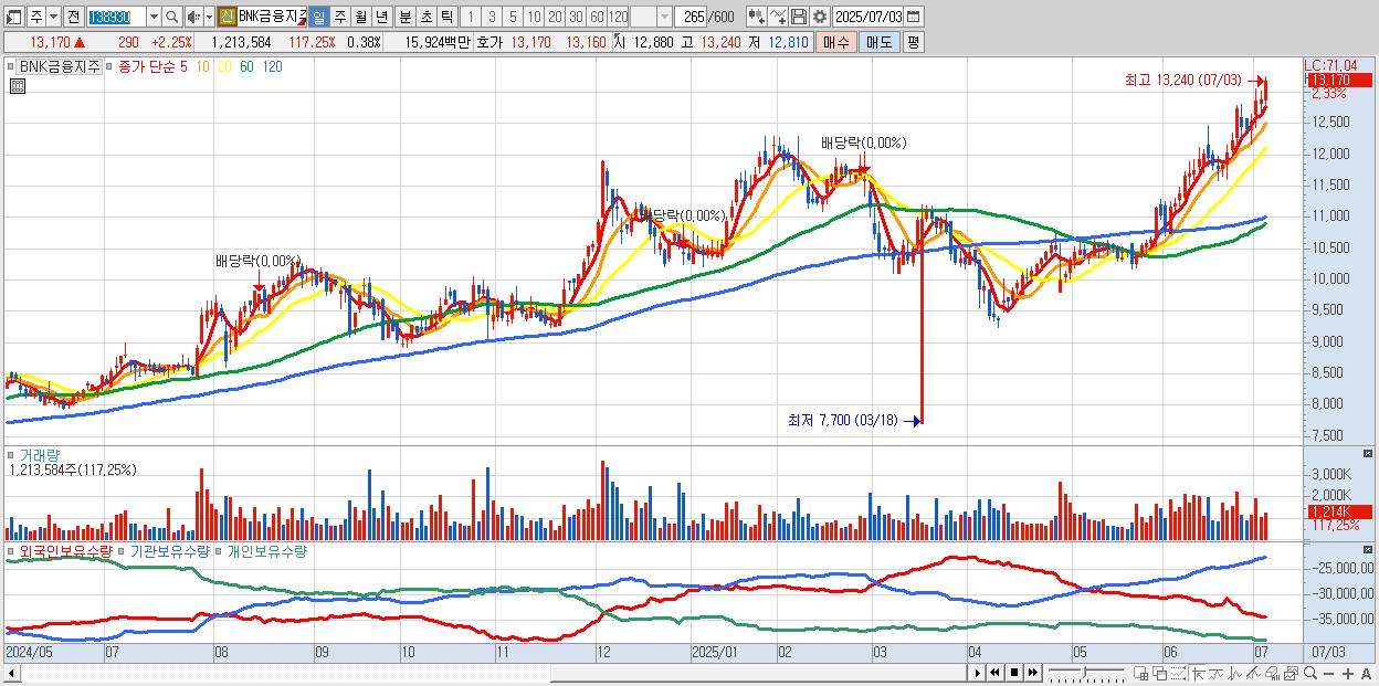 - BNK금융지주 (13,160원 ▲ 2.17% , 시총: 41,899억, 거래량: 1,066,406, 거래대금:140억, KOSPI)