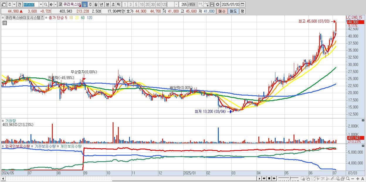 - 큐리옥스바이오시스템즈 (44,500원 ▲ 7.75% , 시총: 7,192억, 거래량: 252,291, 거래대금:112억, KOSDAQ)