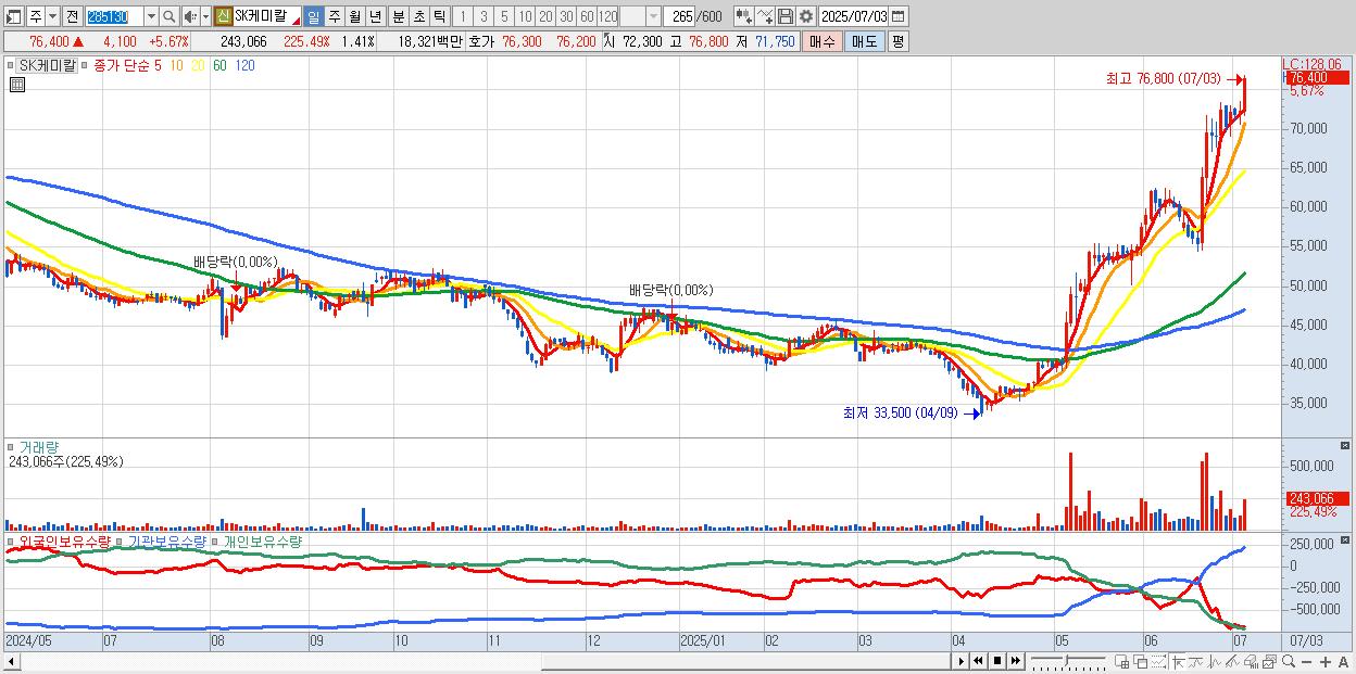 - SK케미칼 (76,700원 ▲ 6.09% , 시총: 13,234억, 거래량: 185,721, 거래대금:140억, KOSPI)