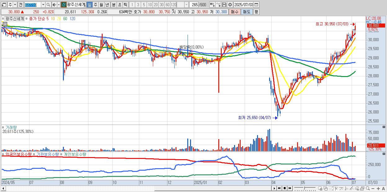 - 광주신세계 (30,800원 ▲ 0.82% , 시총: 2,451억, 거래량: 20,611, 거래대금:6억, KOSPI)