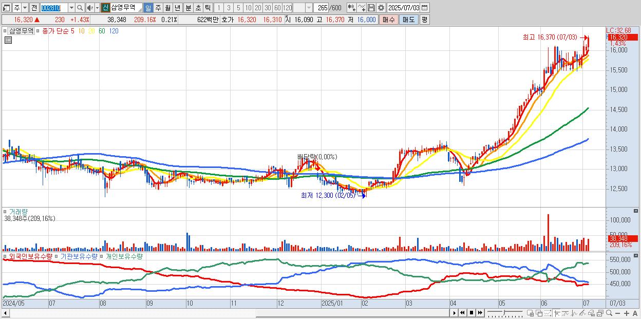 - 삼영무역 (16,320원 ▲ 1.43% , 시총: 3,014억, 거래량: 38,348, 거래대금:6억, KOSPI)