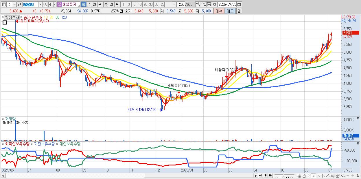- 빛샘전자 (5,630원 ▲ 0.72% , 시총: 453억, 거래량: 45,964, 거래대금:3억, KOSDAQ)